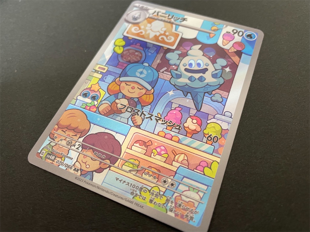 初期にはいなかった食べ物をモチーフにしているポケモンで、登場したイッシュ地方には「ヒウンアイス」というアイテムも登場します。見た目がバニプッチに似ています。ポケモンカードにはアイス屋にいるバニリッチのイラストがあったり、アプリゲームの方のポケモンカードゲームポケットの方では「スイーツリレー」というワザを使えるカードがあったりします。「スイーツリレー」はバニリッチやその進化系だけでなくわたあめのようなペロッパフやクリームの身体のマホミルといったポケモンのカードにも存在し、連携して相手に与えるダメージを増やして戦うことができます。こうしてみるとスイーツ関連のポケモンって結構いますね。